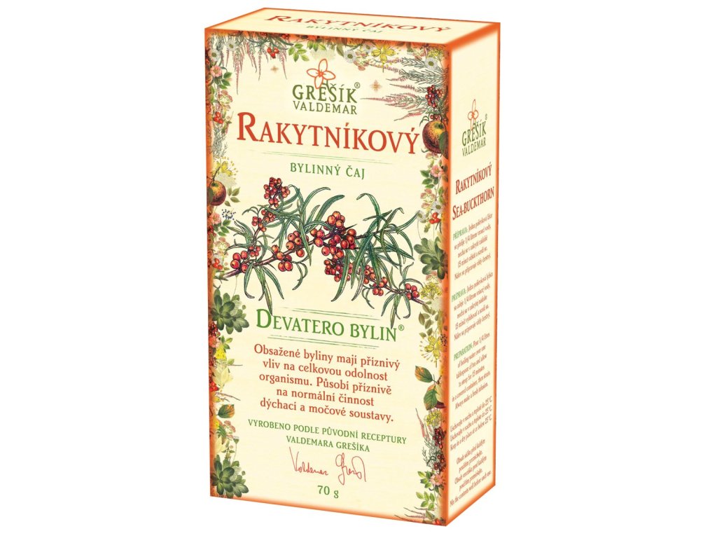 Složení: rakytník plod 60 %, vřes nať, šípek, jablka, bez černý květ, divizna květ, lípa květ, dobromysl nať, sedmikráska květ